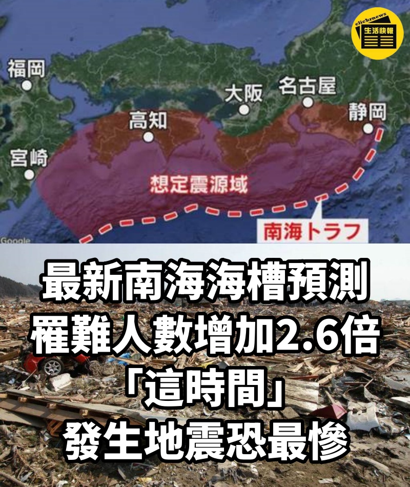 根據媒體《NHK》的報導,日本政府地震調查委員會在上月底預測,未來30年內南海海槽發生巨大地震的機率約為80%,地震規模最大可達9,且會引發巨大海嘯,恐導致29.8萬人罹難,是2011年311大地震的18倍,還不包括後續避難時的疲勞與疾病死亡。