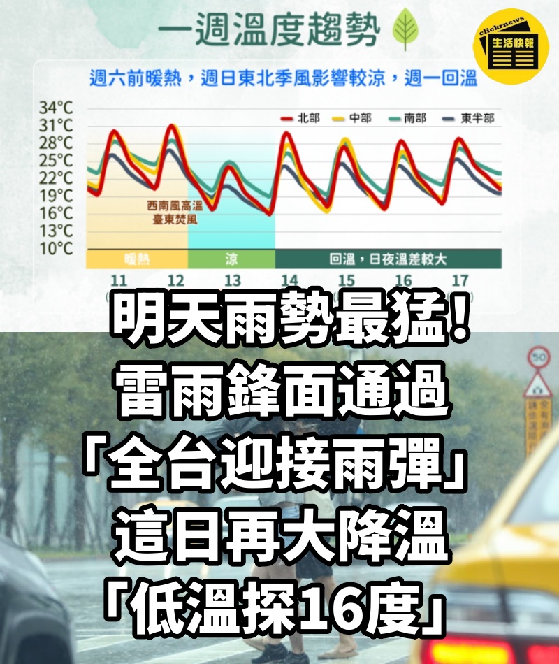明天雨勢最猛!雷雨鋒面通過「全台迎接雨彈」 ...這日再大降溫「低溫探16度」