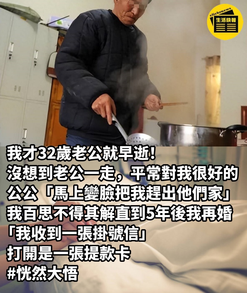 我才32歲老公就早逝! 沒想到老公一走,平常對我很好的公公「馬上變臉把我趕出他們家」....我百思不得其解,直到5年後我再婚「我收到一張掛號信」打開是一張提款卡#恍然大悟