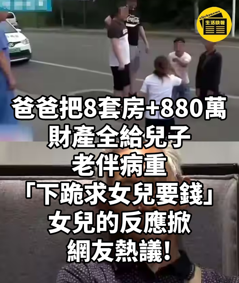 爸爸把「8套房+880萬」財產全給兒子! 老伴病重「下跪求女兒要錢...」女兒的反應掀網友熱議!