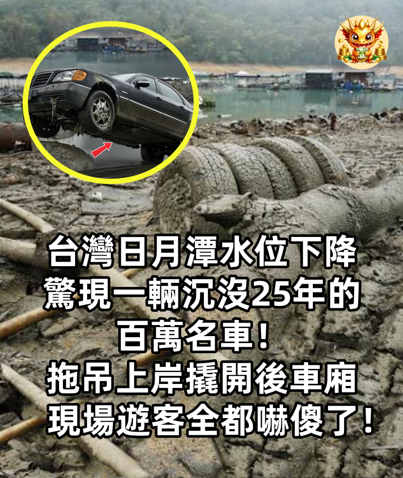 台灣日月潭水位下降,驚現一輛沉沒25年的百萬名車!拖吊上岸撬開後車廂,現場遊客全都嚇傻了!