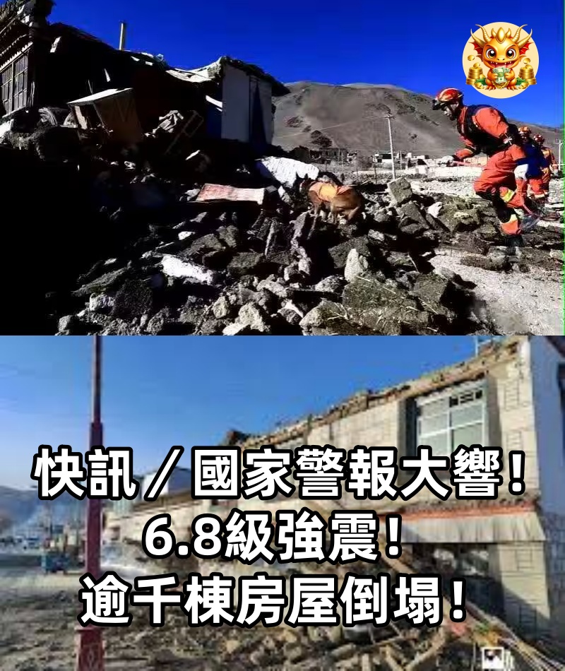 1/4 快訊/國家警報大響!6.8級強震! 逾千棟房屋倒塌! 西藏日喀則市定日縣遭遇規模6.8強震重創,房屋因不堪強震侵襲倒掉上千棟, 幾乎成為一片廢墟,許多民眾逃到戶外避難,嚇得不敢返回屋內,也有人身上帶傷,正等待救援。 2/4 目前災情最