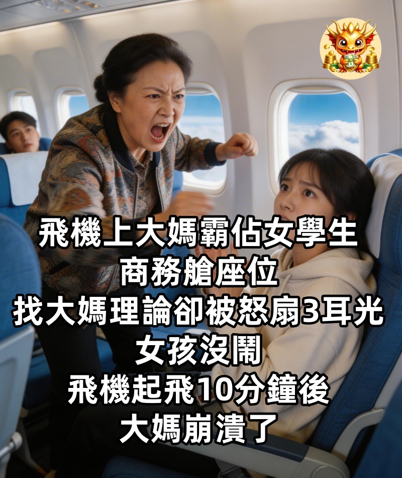 飛機上大媽霸佔女學生商務艙座位,找大媽理論卻被怒扇3耳光,女孩沒鬧,飛機起飛10分鐘後大媽崩潰了