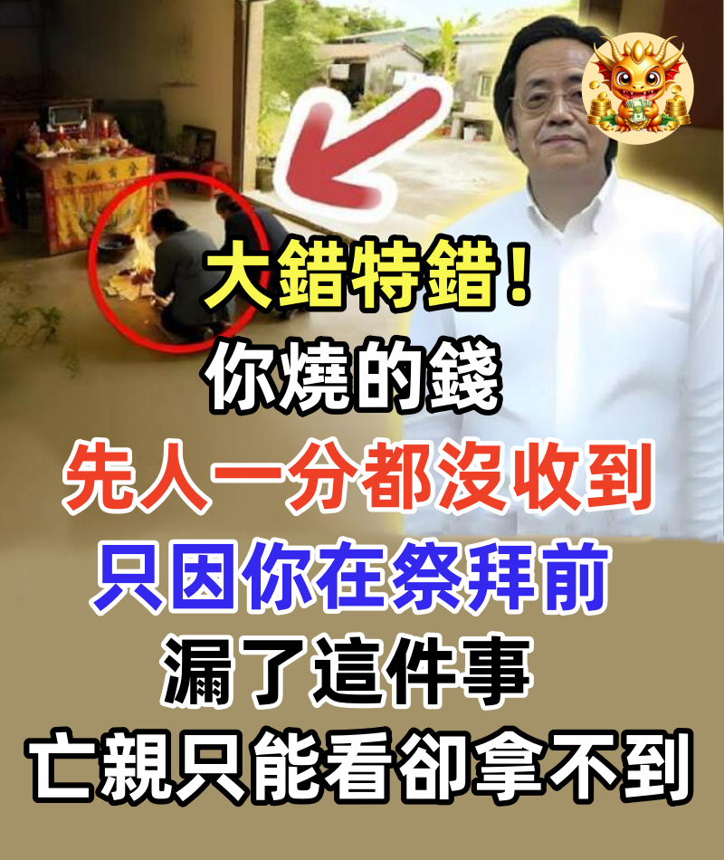 大錯特錯!你燒的錢,先人一分都沒收到,只因你在祭拜前漏了這件事,亡親只能看卻拿不到 1/6 大錯特錯!你燒的錢,先人一分都沒收到每年祭祖掃墓,你滿心誠意地焚燒大把紙錢,以為能讓九泉之下的親人過上好日子。 但你知道嗎? 根據命理大師倪海廈的經典論述,