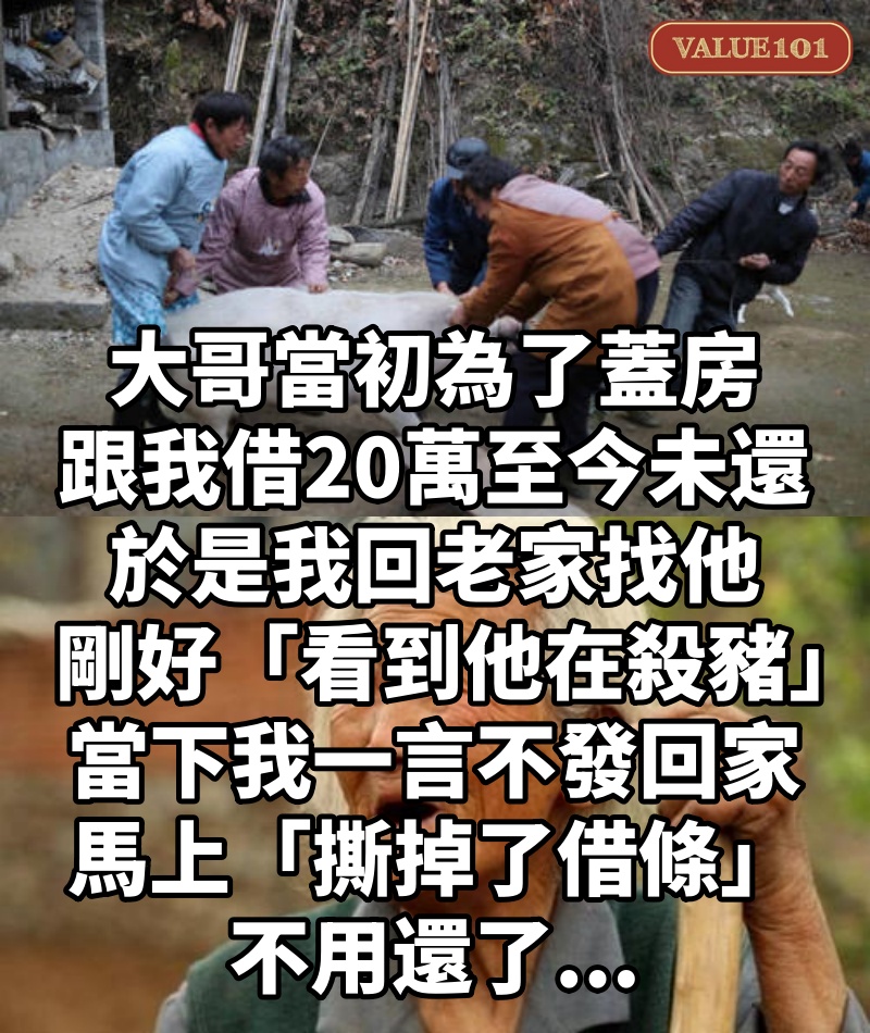 大哥當初為了蓋房,跟我借20萬至今未還,於是我回老家找他,剛好「看到他在殺豬」,當下我一言不發回家,馬上「撕掉了借條」:不用還了...