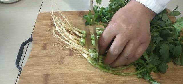 我們把買回來的香菜頭切下來,香菜用來當菜吃。