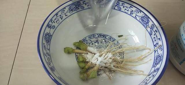 香菜頭把它放在大碗中,加入些小蘇打,加入清水用手把它搓洗乾淨,小蘇打有很強的去污能力,像這樣不好洗的蔬菜加點小蘇打非常好洗,大家看洗成這樣就可以啦,裝盤待用。