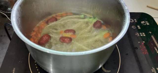 們把洗好的香菜根,紅棗,枸杞一起放入鍋中,加入適量的水大火燒開小火煮它10分鐘,大家看這樣就差不多了,再加入適量的紅糖調均就可以啦。