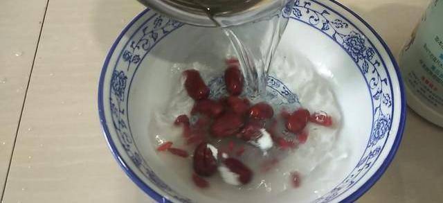 紅棗6粒,枸杞10一起放在大碗中,同樣加入些小蘇打,加入清水用手把它們搓洗乾淨裝盤待用。